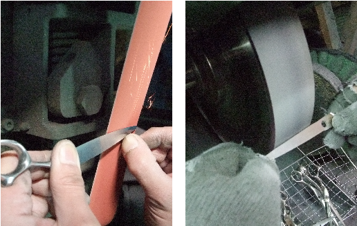 鋼材の違い、用途の違い、によって刃角度を変え、刃線の違いに応じて刃形を整える作業。