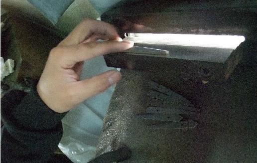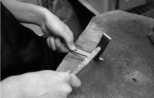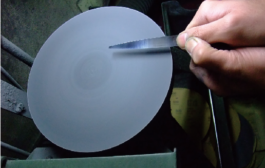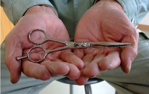 鋏職人が、息を止め砥石の上に置いたハサミを、寸分の狂い無く水平に引くと裏刃がつき、刃の仕上りとなります。