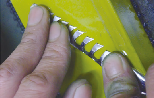 この土台(裏すき・ヒネリ)成形を、極めて高い均一高精度に仕上げることが、最終工程におけるハサミ職人の刃付け及び調子出しの精度、均一性を、極めて高いものにしています。